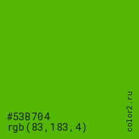 Цвет #53B704 в цветовой модели RGB обозначается тремя октетами (83, 183, 4) в десятичном формате и #53B704 в шестнадцатиричном (hex) формате, которые являются интенсивностью красного 83 (hex 53), интенсивность зелёного 183 (hex B7) и интенсивность синего 4 (hex 04).