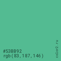 Цвет #53BB92 в цветовой модели RGB обозначается тремя октетами (83, 187, 146) в десятичном формате и #53BB92 в шестнадцатиричном (hex) формате, которые являются интенсивностью красного 83 (hex 53), интенсивность зелёного 187 (hex BB) и интенсивность синего 146 (hex 92).