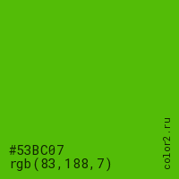 Цвет #53BC07 в цветовой модели RGB обозначается тремя октетами (83, 188, 7) в десятичном формате и #53BC07 в шестнадцатиричном (hex) формате, которые являются интенсивностью красного 83 (hex 53), интенсивность зелёного 188 (hex BC) и интенсивность синего 7 (hex 07).