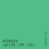 Цвет #53BD88 в цветовой модели RGB обозначается тремя октетами (83, 189, 136) в десятичном формате и #53BD88 в шестнадцатиричном (hex) формате, которые являются интенсивностью красного 83 (hex 53), интенсивность зелёного 189 (hex BD) и интенсивность синего 136 (hex 88).