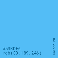 Цвет #53BDF6 в цветовой модели RGB обозначается тремя октетами (83, 189, 246) в десятичном формате и #53BDF6 в шестнадцатиричном (hex) формате, которые являются интенсивностью красного 83 (hex 53), интенсивность зелёного 189 (hex BD) и интенсивность синего 246 (hex F6).