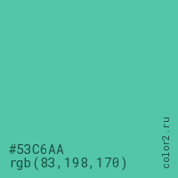 Цвет #53C6AA в цветовой модели RGB обозначается тремя октетами (83, 198, 170) в десятичном формате и #53C6AA в шестнадцатиричном (hex) формате, которые являются интенсивностью красного 83 (hex 53), интенсивность зелёного 198 (hex C6) и интенсивность синего 170 (hex AA).
