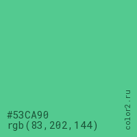 Цвет #53CA90 в цветовой модели RGB обозначается тремя октетами (83, 202, 144) в десятичном формате и #53CA90 в шестнадцатиричном (hex) формате, которые являются интенсивностью красного 83 (hex 53), интенсивность зелёного 202 (hex CA) и интенсивность синего 144 (hex 90).