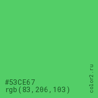 Цвет #53CE67 в цветовой модели RGB обозначается тремя октетами (83, 206, 103) в десятичном формате и #53CE67 в шестнадцатиричном (hex) формате, которые являются интенсивностью красного 83 (hex 53), интенсивность зелёного 206 (hex CE) и интенсивность синего 103 (hex 67).