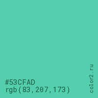 Цвет #53CFAD в цветовой модели RGB обозначается тремя октетами (83, 207, 173) в десятичном формате и #53CFAD в шестнадцатиричном (hex) формате, которые являются интенсивностью красного 83 (hex 53), интенсивность зелёного 207 (hex CF) и интенсивность синего 173 (hex AD).