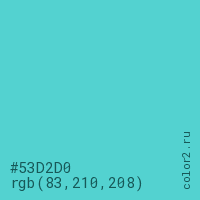 Цвет #53D2D0 в цветовой модели RGB обозначается тремя октетами (83, 210, 208) в десятичном формате и #53D2D0 в шестнадцатиричном (hex) формате, которые являются интенсивностью красного 83 (hex 53), интенсивность зелёного 210 (hex D2) и интенсивность синего 208 (hex D0).
