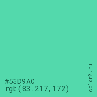 Цвет #53D9AC в цветовой модели RGB обозначается тремя октетами (83, 217, 172) в десятичном формате и #53D9AC в шестнадцатиричном (hex) формате, которые являются интенсивностью красного 83 (hex 53), интенсивность зелёного 217 (hex D9) и интенсивность синего 172 (hex AC).