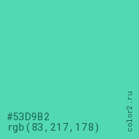 Цвет #53D9B2 в цветовой модели RGB обозначается тремя октетами (83, 217, 178) в десятичном формате и #53D9B2 в шестнадцатиричном (hex) формате, которые являются интенсивностью красного 83 (hex 53), интенсивность зелёного 217 (hex D9) и интенсивность синего 178 (hex B2).