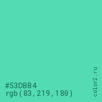 Цвет #53DBB4 в цветовой модели RGB обозначается тремя октетами (83, 219, 180) в десятичном формате и #53DBB4 в шестнадцатиричном (hex) формате, которые являются интенсивностью красного 83 (hex 53), интенсивность зелёного 219 (hex DB) и интенсивность синего 180 (hex B4).
