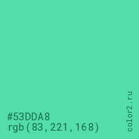 Цвет #53DDA8 в цветовой модели RGB обозначается тремя октетами (83, 221, 168) в десятичном формате и #53DDA8 в шестнадцатиричном (hex) формате, которые являются интенсивностью красного 83 (hex 53), интенсивность зелёного 221 (hex DD) и интенсивность синего 168 (hex A8).
