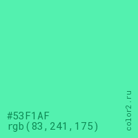 Цвет #53F1AF в цветовой модели RGB обозначается тремя октетами (83, 241, 175) в десятичном формате и #53F1AF в шестнадцатиричном (hex) формате, которые являются интенсивностью красного 83 (hex 53), интенсивность зелёного 241 (hex F1) и интенсивность синего 175 (hex AF).