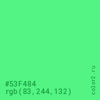 Цвет #53F484 в цветовой модели RGB обозначается тремя октетами (83, 244, 132) в десятичном формате и #53F484 в шестнадцатиричном (hex) формате, которые являются интенсивностью красного 83 (hex 53), интенсивность зелёного 244 (hex F4) и интенсивность синего 132 (hex 84).