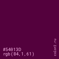 Цвет #54013D в цветовой модели RGB обозначается тремя октетами (84, 1, 61) в десятичном формате и #54013D в шестнадцатиричном (hex) формате, которые являются интенсивностью красного 84 (hex 54), интенсивность зелёного 1 (hex 01) и интенсивность синего 61 (hex 3D).