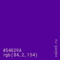 Цвет #54029A в цветовой модели RGB обозначается тремя октетами (84, 2, 154) в десятичном формате и #54029A в шестнадцатиричном (hex) формате, которые являются интенсивностью красного 84 (hex 54), интенсивность зелёного 2 (hex 02) и интенсивность синего 154 (hex 9A).