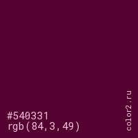 Цвет #540331 в цветовой модели RGB обозначается тремя октетами (84, 3, 49) в десятичном формате и #540331 в шестнадцатиричном (hex) формате, которые являются интенсивностью красного 84 (hex 54), интенсивность зелёного 3 (hex 03) и интенсивность синего 49 (hex 31).
