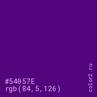 Цвет #54057E в цветовой модели RGB обозначается тремя октетами (84, 5, 126) в десятичном формате и #54057E в шестнадцатиричном (hex) формате, которые являются интенсивностью красного 84 (hex 54), интенсивность зелёного 5 (hex 05) и интенсивность синего 126 (hex 7E).