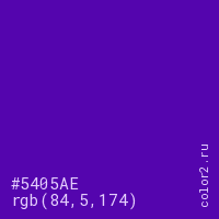 Цвет #5405AE в цветовой модели RGB обозначается тремя октетами (84, 5, 174) в десятичном формате и #5405AE в шестнадцатиричном (hex) формате, которые являются интенсивностью красного 84 (hex 54), интенсивность зелёного 5 (hex 05) и интенсивность синего 174 (hex AE).