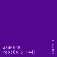 Цвет #540690 в цветовой модели RGB обозначается тремя октетами (84, 6, 144) в десятичном формате и #540690 в шестнадцатиричном (hex) формате, которые являются интенсивностью красного 84 (hex 54), интенсивность зелёного 6 (hex 06) и интенсивность синего 144 (hex 90).