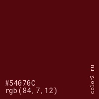 Цвет #54070C в цветовой модели RGB обозначается тремя октетами (84, 7, 12) в десятичном формате и #54070C в шестнадцатиричном (hex) формате, которые являются интенсивностью красного 84 (hex 54), интенсивность зелёного 7 (hex 07) и интенсивность синего 12 (hex 0C).
