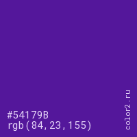 Цвет #54179B в цветовой модели RGB обозначается тремя октетами (84, 23, 155) в десятичном формате и #54179B в шестнадцатиричном (hex) формате, которые являются интенсивностью красного 84 (hex 54), интенсивность зелёного 23 (hex 17) и интенсивность синего 155 (hex 9B).