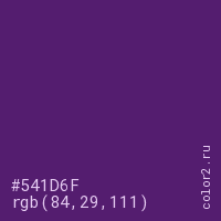 Цвет #541D6F в цветовой модели RGB обозначается тремя октетами (84, 29, 111) в десятичном формате и #541D6F в шестнадцатиричном (hex) формате, которые являются интенсивностью красного 84 (hex 54), интенсивность зелёного 29 (hex 1D) и интенсивность синего 111 (hex 6F).