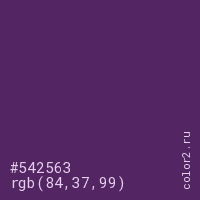 Цвет #542563 в цветовой модели RGB обозначается тремя октетами (84, 37, 99) в десятичном формате и #542563 в шестнадцатиричном (hex) формате, которые являются интенсивностью красного 84 (hex 54), интенсивность зелёного 37 (hex 25) и интенсивность синего 99 (hex 63).