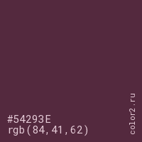 Цвет #54293E в цветовой модели RGB обозначается тремя октетами (84, 41, 62) в десятичном формате и #54293E в шестнадцатиричном (hex) формате, которые являются интенсивностью красного 84 (hex 54), интенсивность зелёного 41 (hex 29) и интенсивность синего 62 (hex 3E).