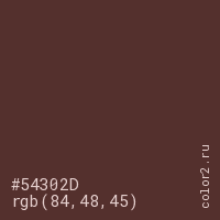 Цвет #54302D в цветовой модели RGB обозначается тремя октетами (84, 48, 45) в десятичном формате и #54302D в шестнадцатиричном (hex) формате, которые являются интенсивностью красного 84 (hex 54), интенсивность зелёного 48 (hex 30) и интенсивность синего 45 (hex 2D).