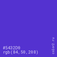Цвет #5432D0 в цветовой модели RGB обозначается тремя октетами (84, 50, 208) в десятичном формате и #5432D0 в шестнадцатиричном (hex) формате, которые являются интенсивностью красного 84 (hex 54), интенсивность зелёного 50 (hex 32) и интенсивность синего 208 (hex D0).