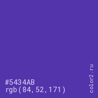 Цвет #5434AB в цветовой модели RGB обозначается тремя октетами (84, 52, 171) в десятичном формате и #5434AB в шестнадцатиричном (hex) формате, которые являются интенсивностью красного 84 (hex 54), интенсивность зелёного 52 (hex 34) и интенсивность синего 171 (hex AB).
