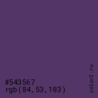 Цвет #543567 в цветовой модели RGB обозначается тремя октетами (84, 53, 103) в десятичном формате и #543567 в шестнадцатиричном (hex) формате, которые являются интенсивностью красного 84 (hex 54), интенсивность зелёного 53 (hex 35) и интенсивность синего 103 (hex 67).
