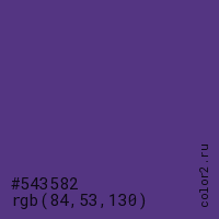 Цвет #543582 в цветовой модели RGB обозначается тремя октетами (84, 53, 130) в десятичном формате и #543582 в шестнадцатиричном (hex) формате, которые являются интенсивностью красного 84 (hex 54), интенсивность зелёного 53 (hex 35) и интенсивность синего 130 (hex 82).