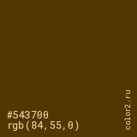 Цвет #543700 в цветовой модели RGB обозначается тремя октетами (84, 55, 0) в десятичном формате и #543700 в шестнадцатиричном (hex) формате, которые являются интенсивностью красного 84 (hex 54), интенсивность зелёного 55 (hex 37) и интенсивность синего 0 (hex 00).