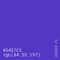 Цвет #5437C5 в цветовой модели RGB обозначается тремя октетами (84, 55, 197) в десятичном формате и #5437C5 в шестнадцатиричном (hex) формате, которые являются интенсивностью красного 84 (hex 54), интенсивность зелёного 55 (hex 37) и интенсивность синего 197 (hex C5).