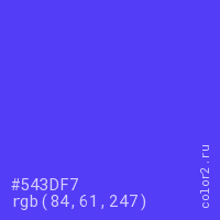Цвет #543DF7 в цветовой модели RGB обозначается тремя октетами (84, 61, 247) в десятичном формате и #543DF7 в шестнадцатиричном (hex) формате, которые являются интенсивностью красного 84 (hex 54), интенсивность зелёного 61 (hex 3D) и интенсивность синего 247 (hex F7).