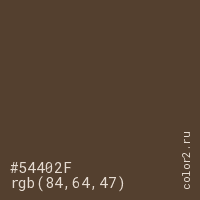 Цвет #54402F в цветовой модели RGB обозначается тремя октетами (84, 64, 47) в десятичном формате и #54402F в шестнадцатиричном (hex) формате, которые являются интенсивностью красного 84 (hex 54), интенсивность зелёного 64 (hex 40) и интенсивность синего 47 (hex 2F).