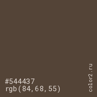 Цвет #544437 в цветовой модели RGB обозначается тремя октетами (84, 68, 55) в десятичном формате и #544437 в шестнадцатиричном (hex) формате, которые являются интенсивностью красного 84 (hex 54), интенсивность зелёного 68 (hex 44) и интенсивность синего 55 (hex 37).