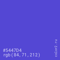 Цвет #5447D4 в цветовой модели RGB обозначается тремя октетами (84, 71, 212) в десятичном формате и #5447D4 в шестнадцатиричном (hex) формате, которые являются интенсивностью красного 84 (hex 54), интенсивность зелёного 71 (hex 47) и интенсивность синего 212 (hex D4).