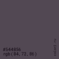 Цвет #544856 в цветовой модели RGB обозначается тремя октетами (84, 72, 86) в десятичном формате и #544856 в шестнадцатиричном (hex) формате, которые являются интенсивностью красного 84 (hex 54), интенсивность зелёного 72 (hex 48) и интенсивность синего 86 (hex 56).