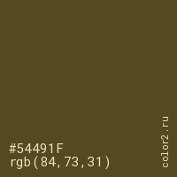 Цвет #54491F в цветовой модели RGB обозначается тремя октетами (84, 73, 31) в десятичном формате и #54491F в шестнадцатиричном (hex) формате, которые являются интенсивностью красного 84 (hex 54), интенсивность зелёного 73 (hex 49) и интенсивность синего 31 (hex 1F).