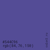 Цвет #544C96 в цветовой модели RGB обозначается тремя октетами (84, 76, 150) в десятичном формате и #544C96 в шестнадцатиричном (hex) формате, которые являются интенсивностью красного 84 (hex 54), интенсивность зелёного 76 (hex 4C) и интенсивность синего 150 (hex 96).