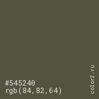Цвет #545240 в цветовой модели RGB обозначается тремя октетами (84, 82, 64) в десятичном формате и #545240 в шестнадцатиричном (hex) формате, которые являются интенсивностью красного 84 (hex 54), интенсивность зелёного 82 (hex 52) и интенсивность синего 64 (hex 40).