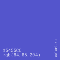 Цвет #5455CC в цветовой модели RGB обозначается тремя октетами (84, 85, 204) в десятичном формате и #5455CC в шестнадцатиричном (hex) формате, которые являются интенсивностью красного 84 (hex 54), интенсивность зелёного 85 (hex 55) и интенсивность синего 204 (hex CC).
