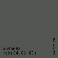 Цвет #545653 в цветовой модели RGB обозначается тремя октетами (84, 86, 83) в десятичном формате и #545653 в шестнадцатиричном (hex) формате, которые являются интенсивностью красного 84 (hex 54), интенсивность зелёного 86 (hex 56) и интенсивность синего 83 (hex 53).