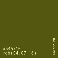 Цвет #545710 в цветовой модели RGB обозначается тремя октетами (84, 87, 16) в десятичном формате и #545710 в шестнадцатиричном (hex) формате, которые являются интенсивностью красного 84 (hex 54), интенсивность зелёного 87 (hex 57) и интенсивность синего 16 (hex 10).