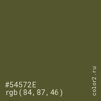 Цвет #54572E в цветовой модели RGB обозначается тремя октетами (84, 87, 46) в десятичном формате и #54572E в шестнадцатиричном (hex) формате, которые являются интенсивностью красного 84 (hex 54), интенсивность зелёного 87 (hex 57) и интенсивность синего 46 (hex 2E).