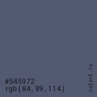 Цвет #545972 в цветовой модели RGB обозначается тремя октетами (84, 89, 114) в десятичном формате и #545972 в шестнадцатиричном (hex) формате, которые являются интенсивностью красного 84 (hex 54), интенсивность зелёного 89 (hex 59) и интенсивность синего 114 (hex 72).