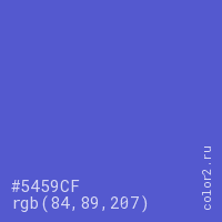 Цвет #5459CF в цветовой модели RGB обозначается тремя октетами (84, 89, 207) в десятичном формате и #5459CF в шестнадцатиричном (hex) формате, которые являются интенсивностью красного 84 (hex 54), интенсивность зелёного 89 (hex 59) и интенсивность синего 207 (hex CF).