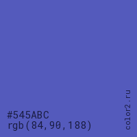 Цвет #545ABC в цветовой модели RGB обозначается тремя октетами (84, 90, 188) в десятичном формате и #545ABC в шестнадцатиричном (hex) формате, которые являются интенсивностью красного 84 (hex 54), интенсивность зелёного 90 (hex 5A) и интенсивность синего 188 (hex BC).