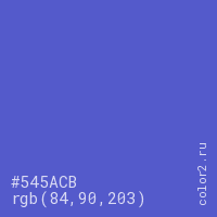 Цвет #545ACB в цветовой модели RGB обозначается тремя октетами (84, 90, 203) в десятичном формате и #545ACB в шестнадцатиричном (hex) формате, которые являются интенсивностью красного 84 (hex 54), интенсивность зелёного 90 (hex 5A) и интенсивность синего 203 (hex CB).